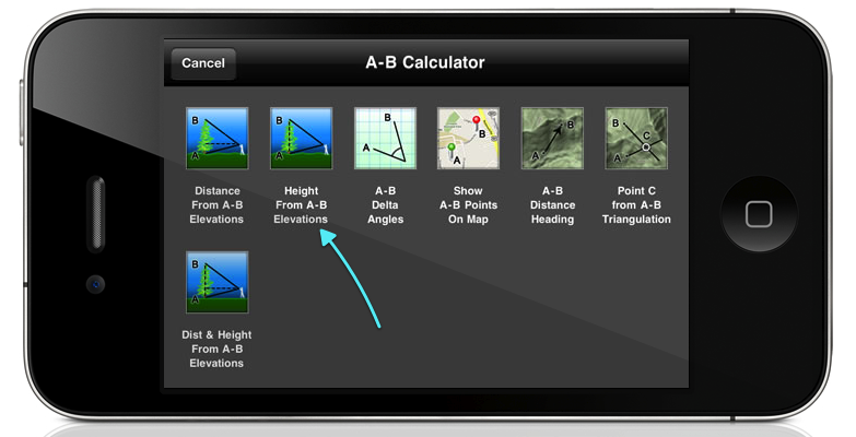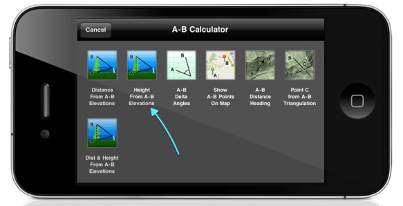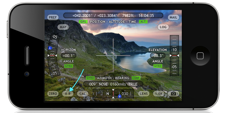 Once the phone is mounted, you point the center at the top of the object and push the “A” buttton to take a reading. Then tilt the device toward the bottom of the object and take the “B” reading.