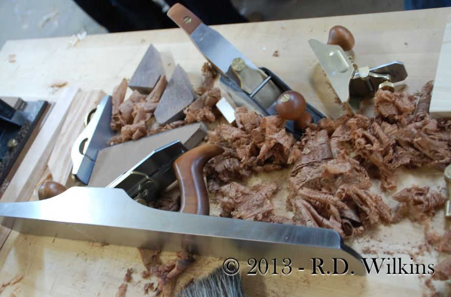 When the blade is set properly and the plane is held parallel to the wood, you get a beautiful, continuous strip of wood that comes off the work piece. Instead of sawdust from a modern power tool you get this lovely pile of curly shavings. The bottom photo is of the final plane shaving. It’s a few thou of an inch thick or about the thickness of a piece of 1000H vellum. It’s impossible to do that with a power tool.