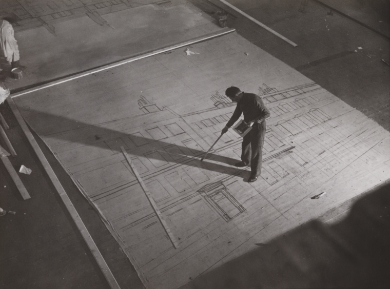 A scenic lays out a backing at Ealing Studios in London in 1939 for the film “Young Man’s Fancy”. National Media Museum