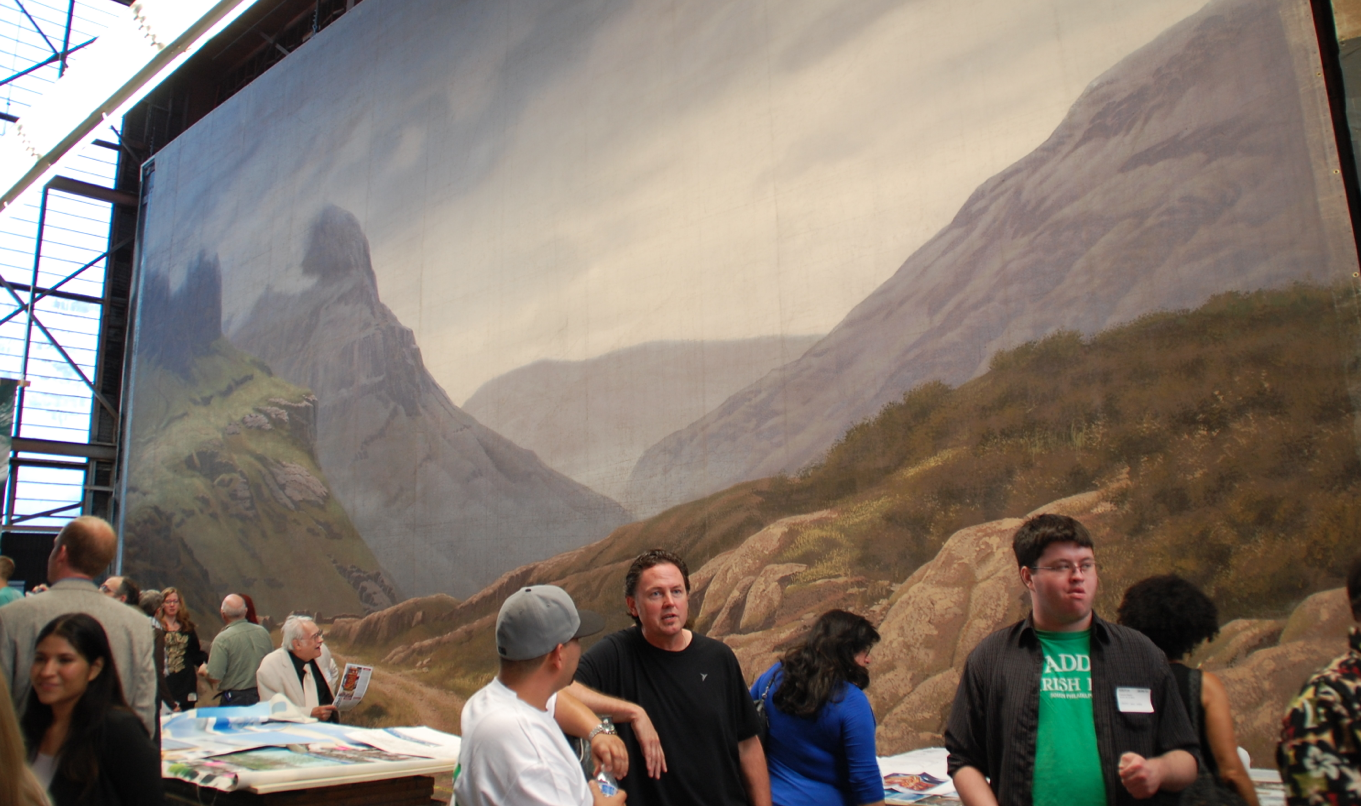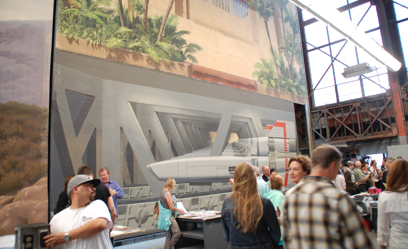 Years ago I was working on a feature that involve a 160′ long backing of a coastline and ocean view. It had to match a location which was a modern house with floor to ceiling glass panels. The designer suggested a painted backing would be better for many reasons.
