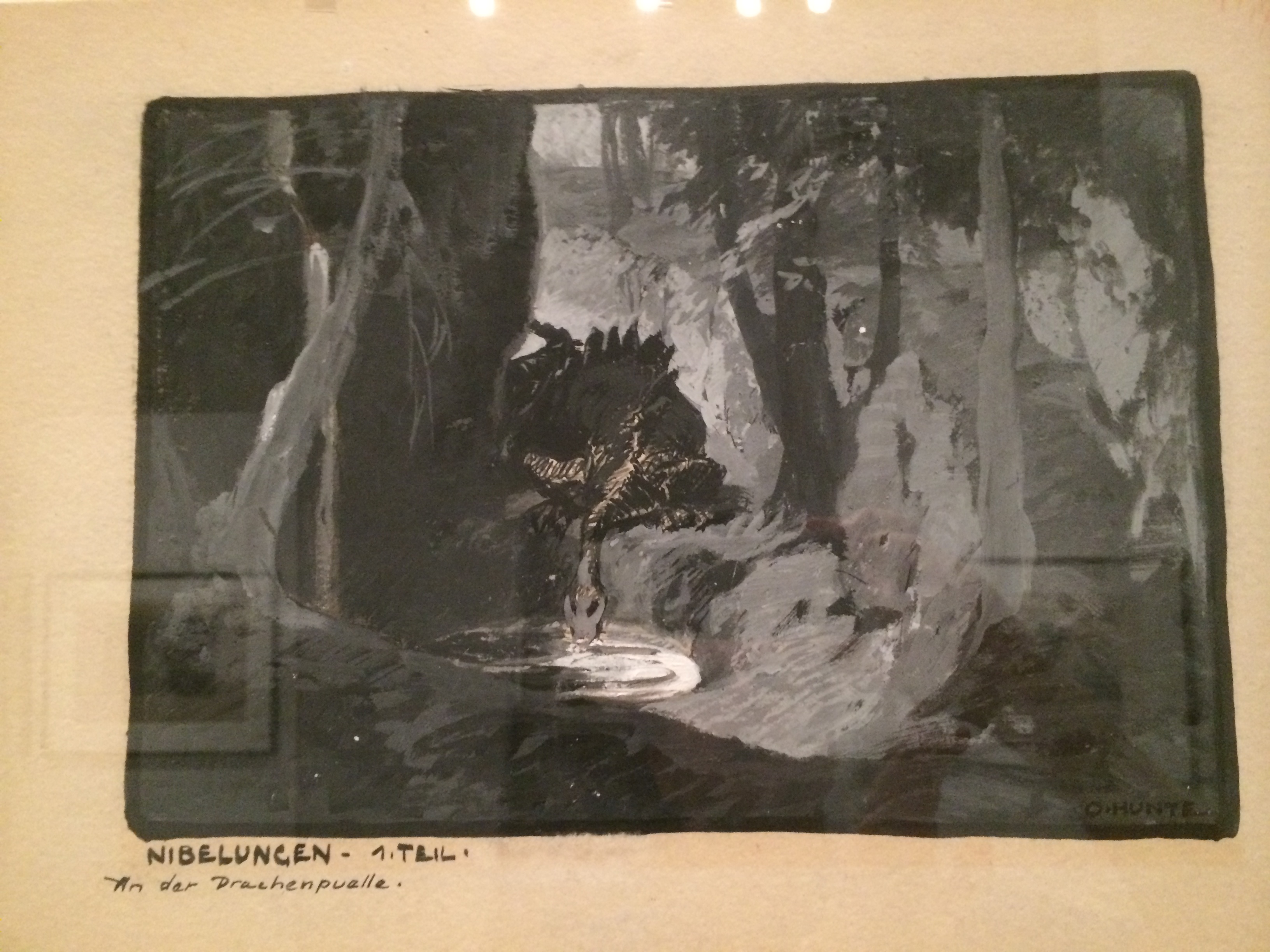 It was common during this period of German cinema for Art Directors to work in teams of two or three people, dividing the design duties among themselves as matched their individual abilities. A perfect example of this is the work of Otto Hunte and Erich Kettelhut on Fritz Lang’s The Nibelungen. Here is a drawing by Hunte of the dragon by the waterfall.