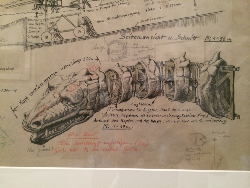 Kettelhut called out the length of the neck as well as the eye detail, tension springs, framework, control cables and hoses required for the creatures fiery breath. He calls out “only rubber!” for the mouth area.