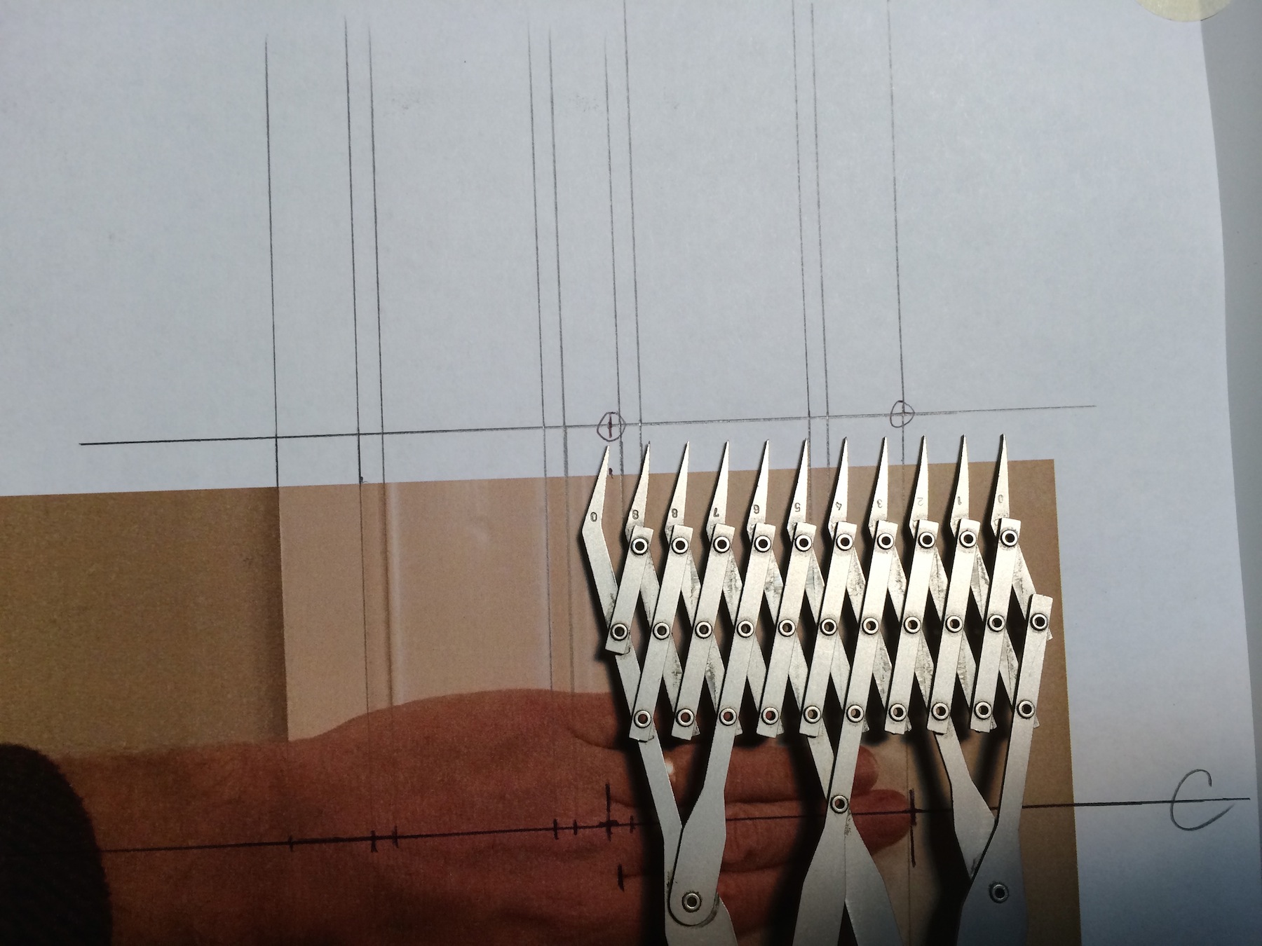 IMG_6886Now transfer these two points to the new datum line at the top of the photo. With the dividers, open them along this datum line allowing the distance between each point to equal 1/2″. They can represent any distance you want them to, but 1/2″ works best for this example. This means that 7 1/2 spaces will equal 3 3/4″ scale inches along the new datum.
