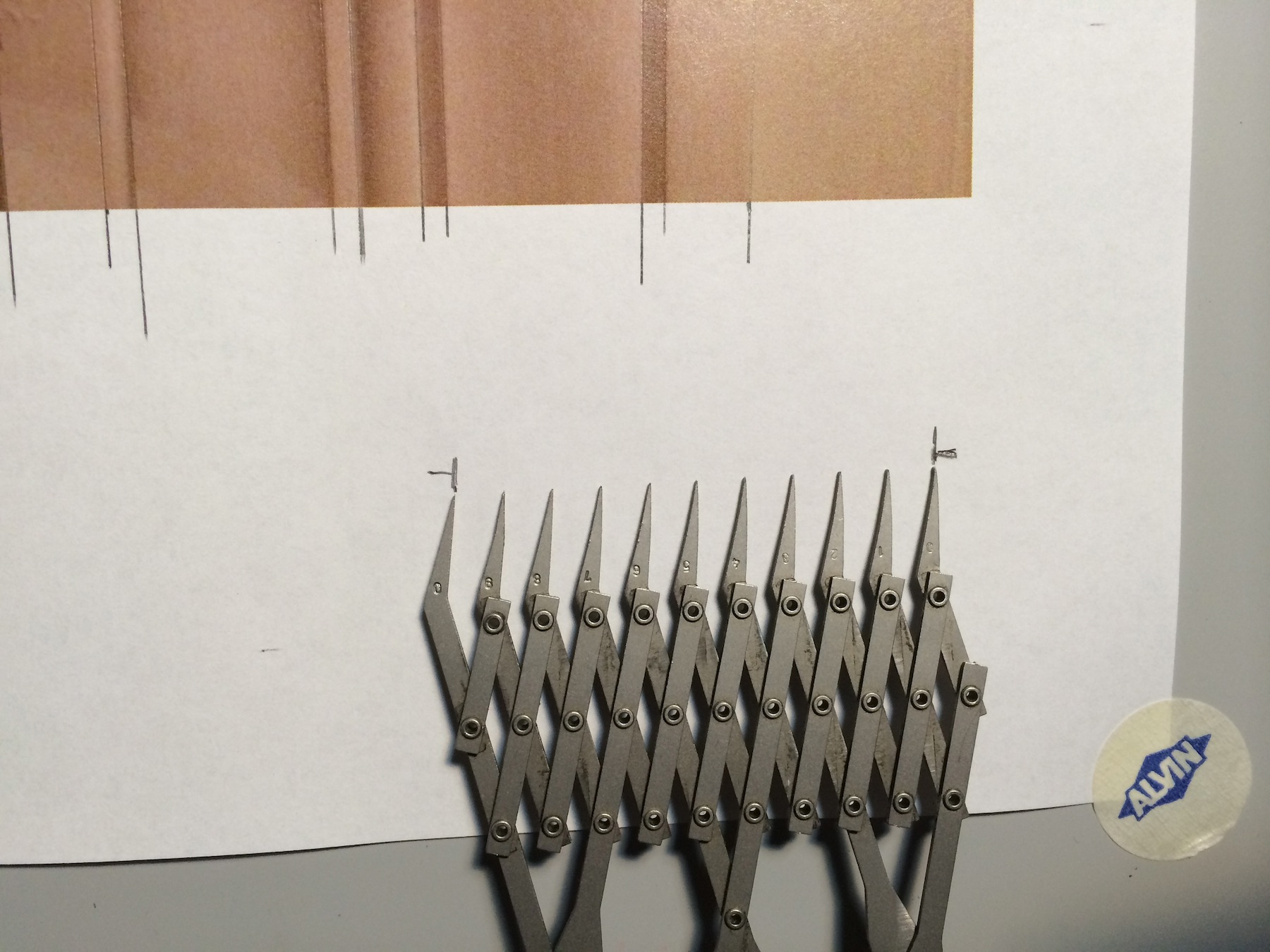 IMG_6887Once you have these marks set, carefully move down to the bottom of the page and mark the distance at the first and last point. As each space represents 1/2″, the distance over the width of the dividers is a scale 5″ along the nomen line. For accuracy you’ll want to continuously check the spacing of the dividers against this ‘master’ to be sure you haven’t changed the setting. Most dividers are manufactured with fairly ‘tight’ joints but you can easily bump them while you’re working and throw off the setting.