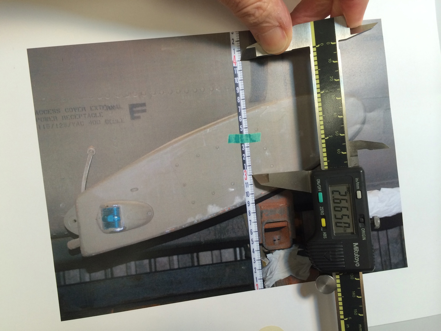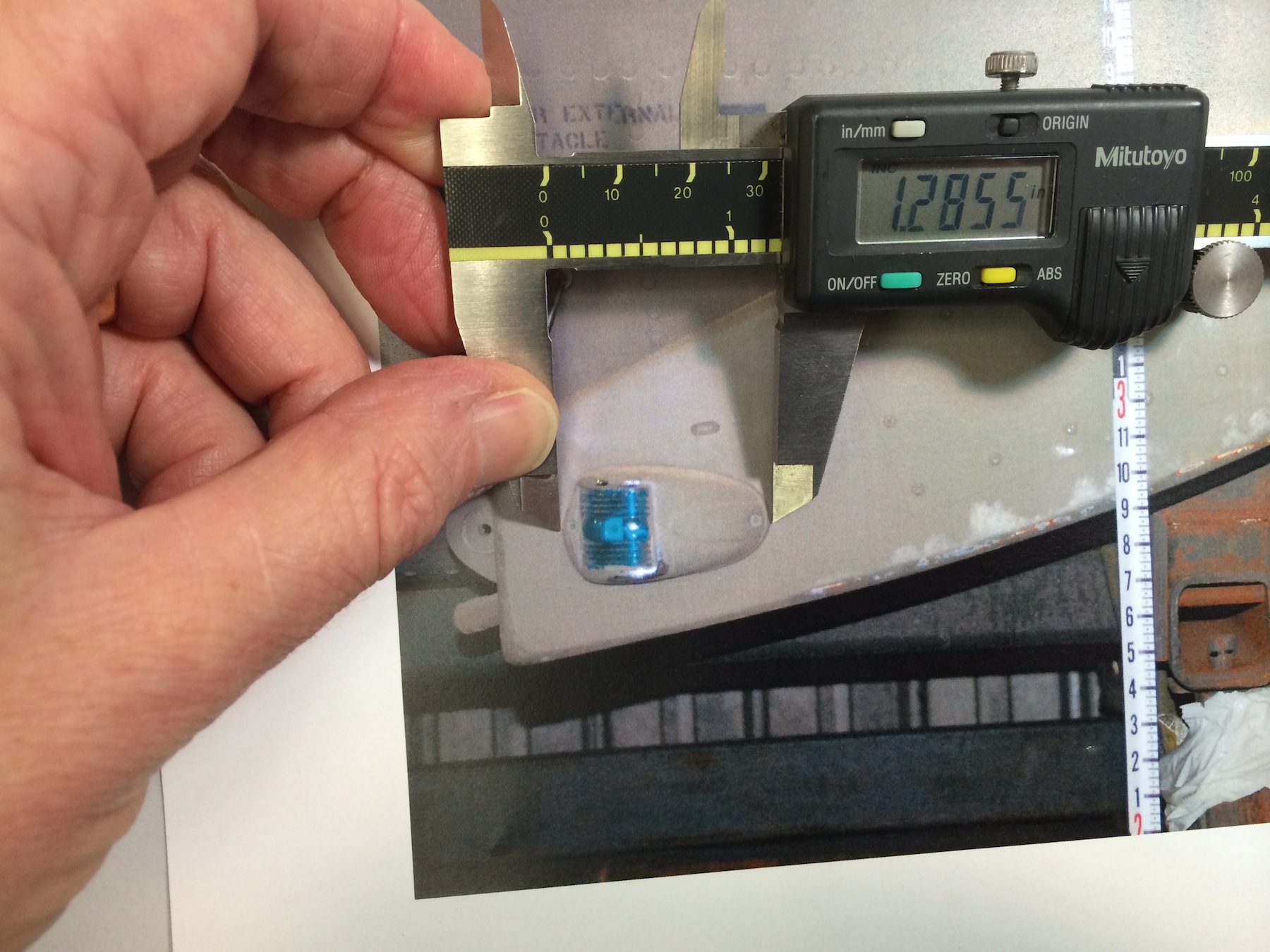 IMG_7157The nomen in this photo is a Keson Pocket Rod, a retractable builder’s survey pole, ( don’t know if it comes in a metric version) if you don’t have one, get one right now. You’ll wonder how you got by without it. With a graduated scale in the photo it’s easy to find a correct scale. Turn the calipers on, squeeze the jaws together and zero out the reading. then you just set the jaws between a one foot increment and record the reading.