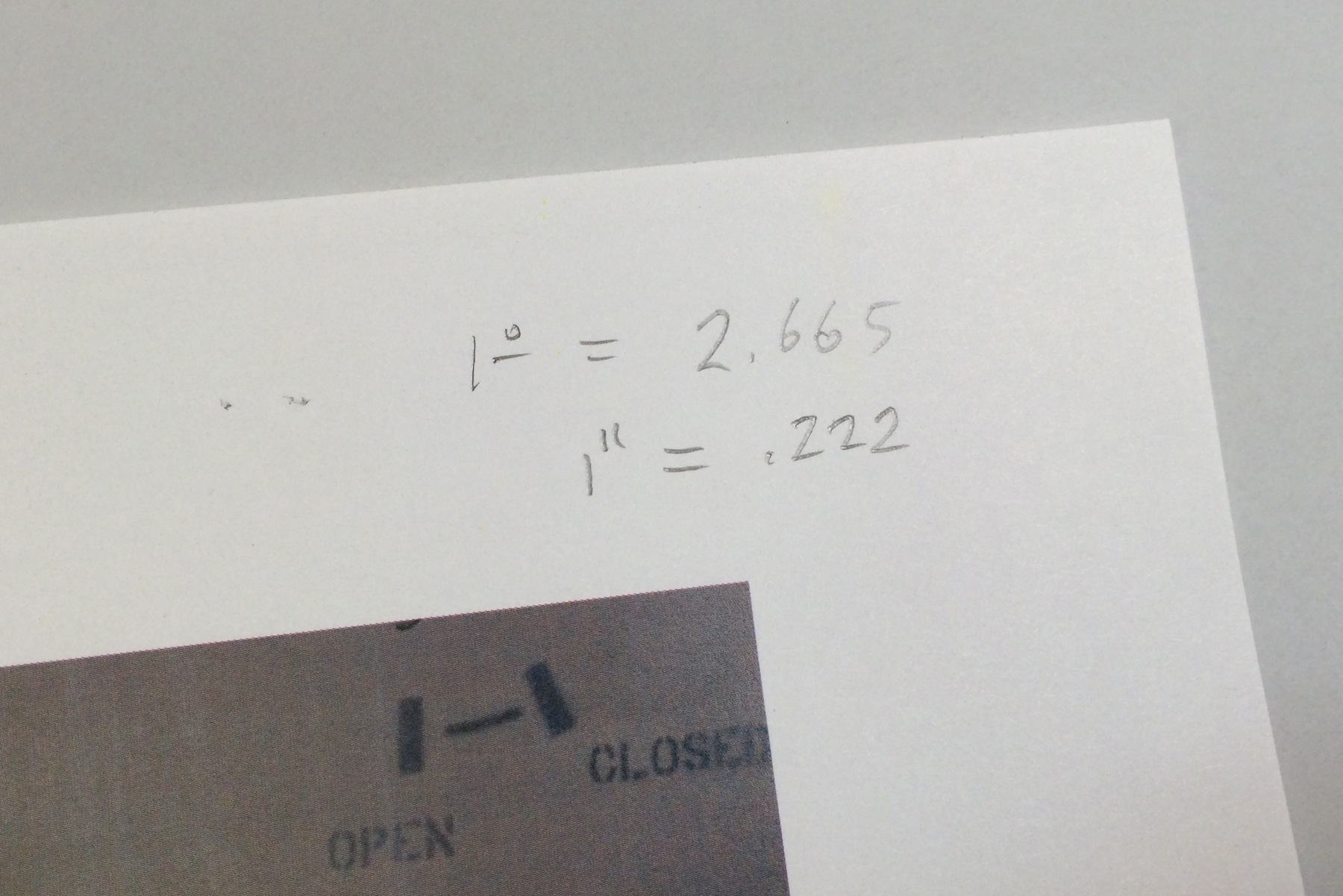 IMG_7158In this example 1 foot equals 2.665 inches. Divide this number by 12 and you come up with .222 inches equaling 1″ in the photo. Record these numbers for reference at the top of the photo. Remember that this equivalent will only be accurate over the whole area of the photo if you have been careful to make sure your camera was perpendicular to your subject matter.
