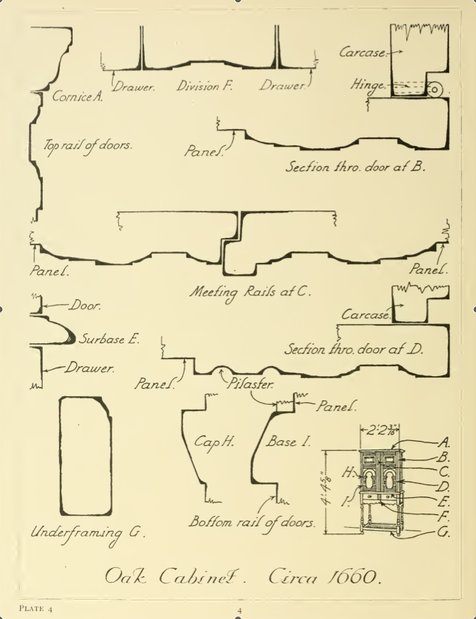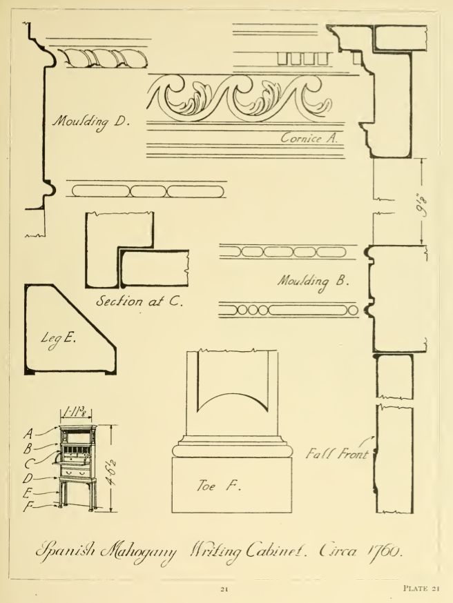 “This book covers many different types of English furniture; bedsteads, bookcases, bureaus, cabinets, chests, cupboards, chairs and others. This book illustrates cover this book covers molding details on English furniture from about 1574 to 1820 molding is the method adopted by the cabinetmaker to give definition to the lines of his work and the sections of molded detail very very much as one style has succeeded another through the oak, walnut, mahogany and satinwood periods of English furniture the workings of moldings was then so laborious that the craftsman use them with greater restraint and obtained more pleasing effects by their use than is frequently the case today when profusion often eliminates interest.”