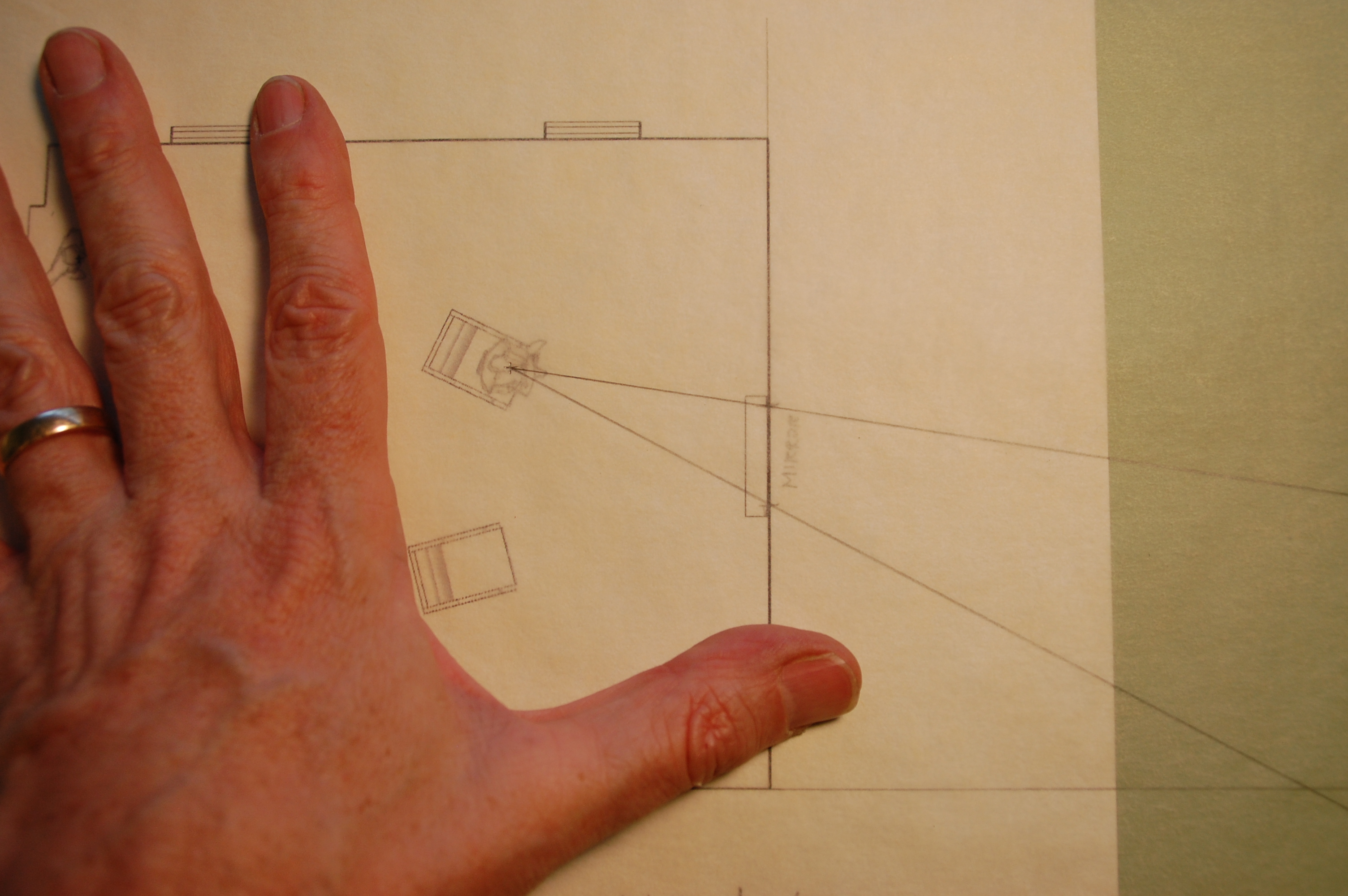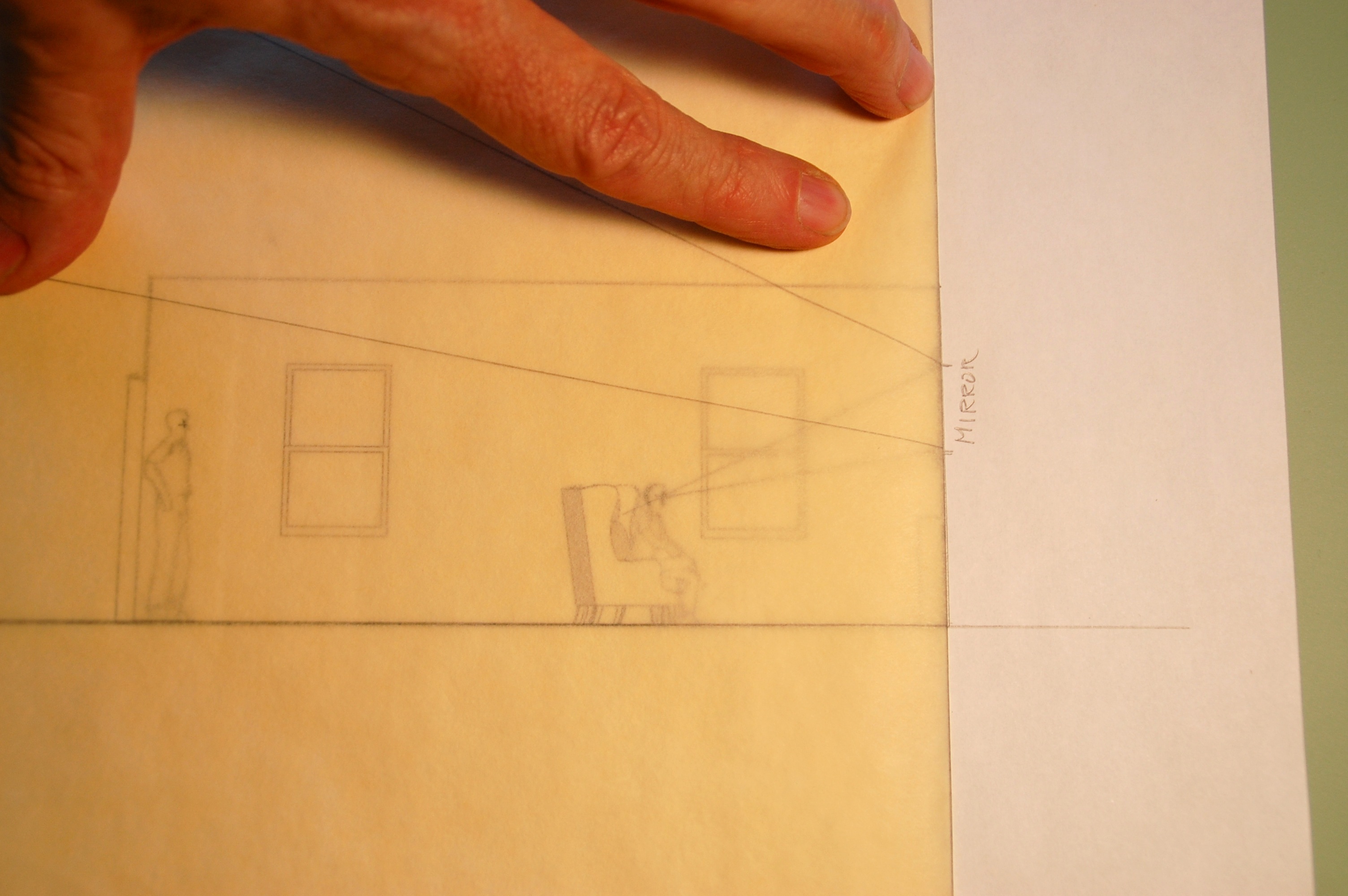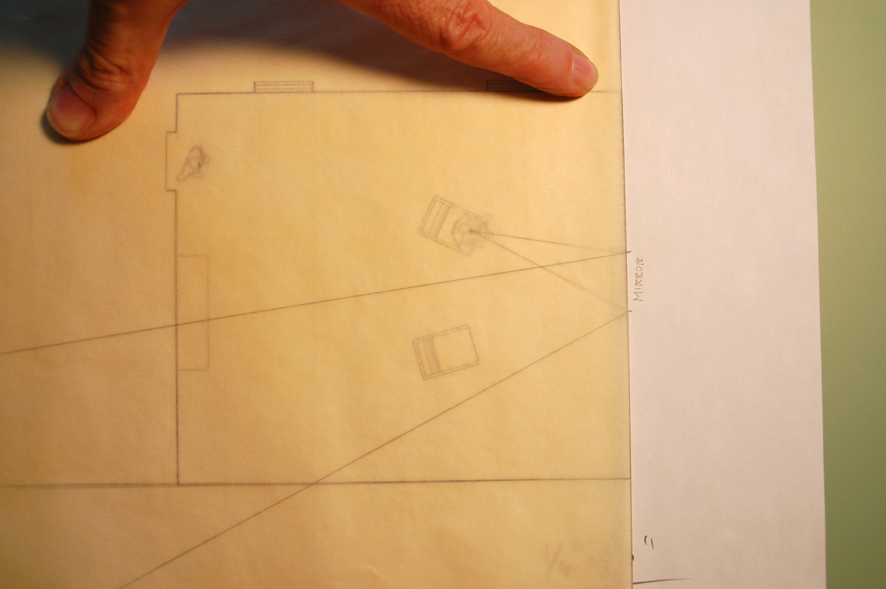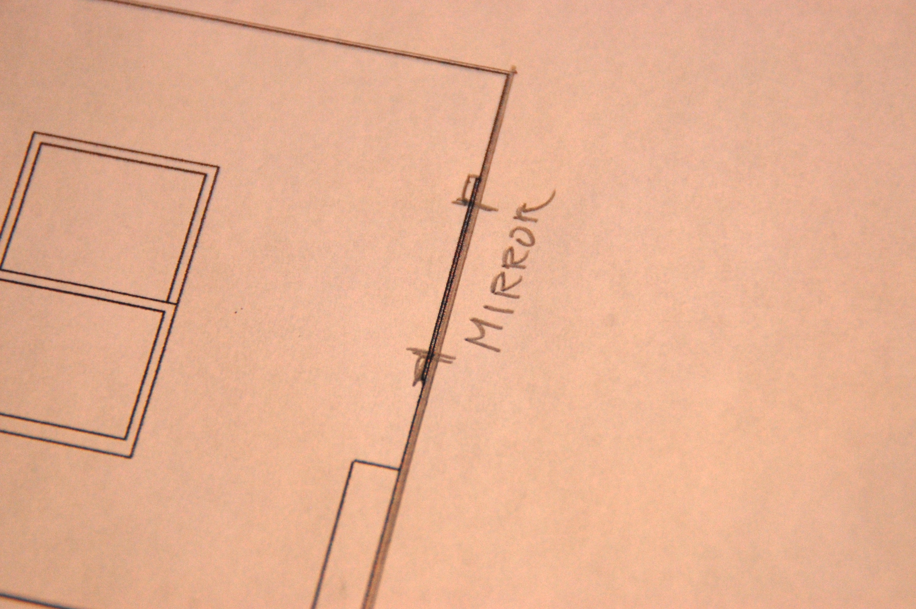 You’ll want to have the plan view and an elevation. Line them up so that the plane of the mirror is along an identical line. It doesn’t have to be in any certain scale as long as they are both the same size. It can be a printout or just a quick drawing on grid paper, as long as the mirror is correctly placed and sized.
