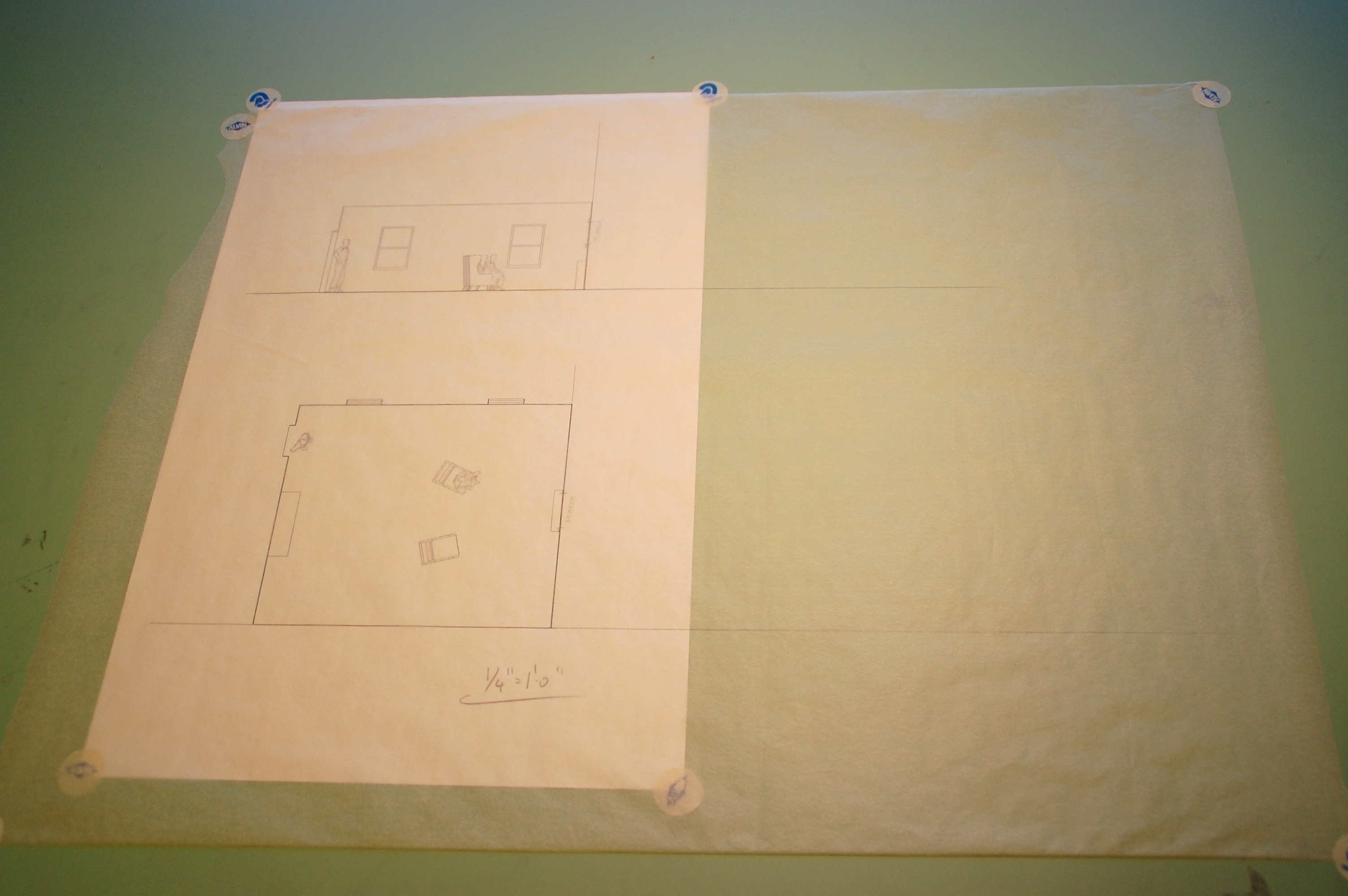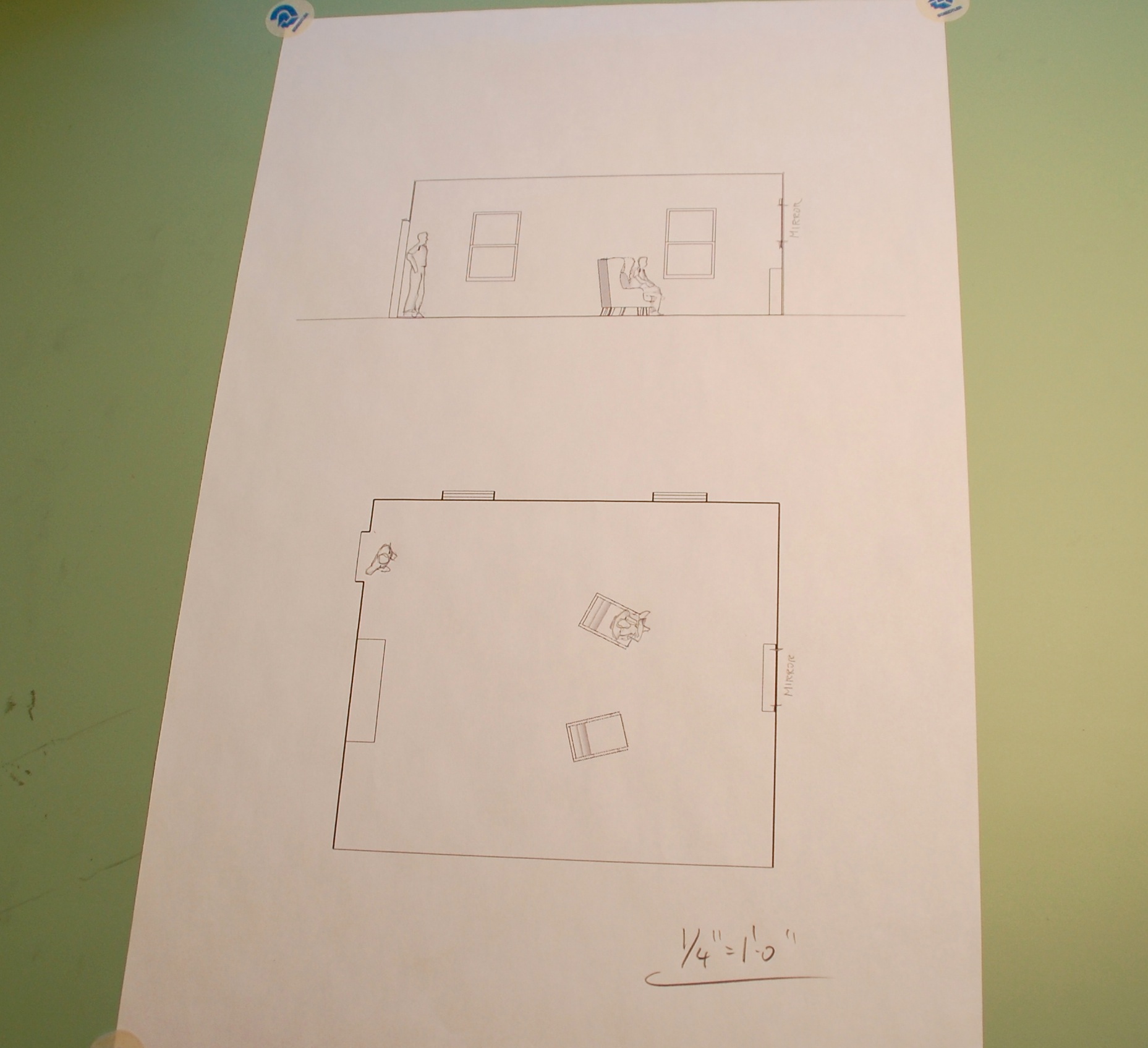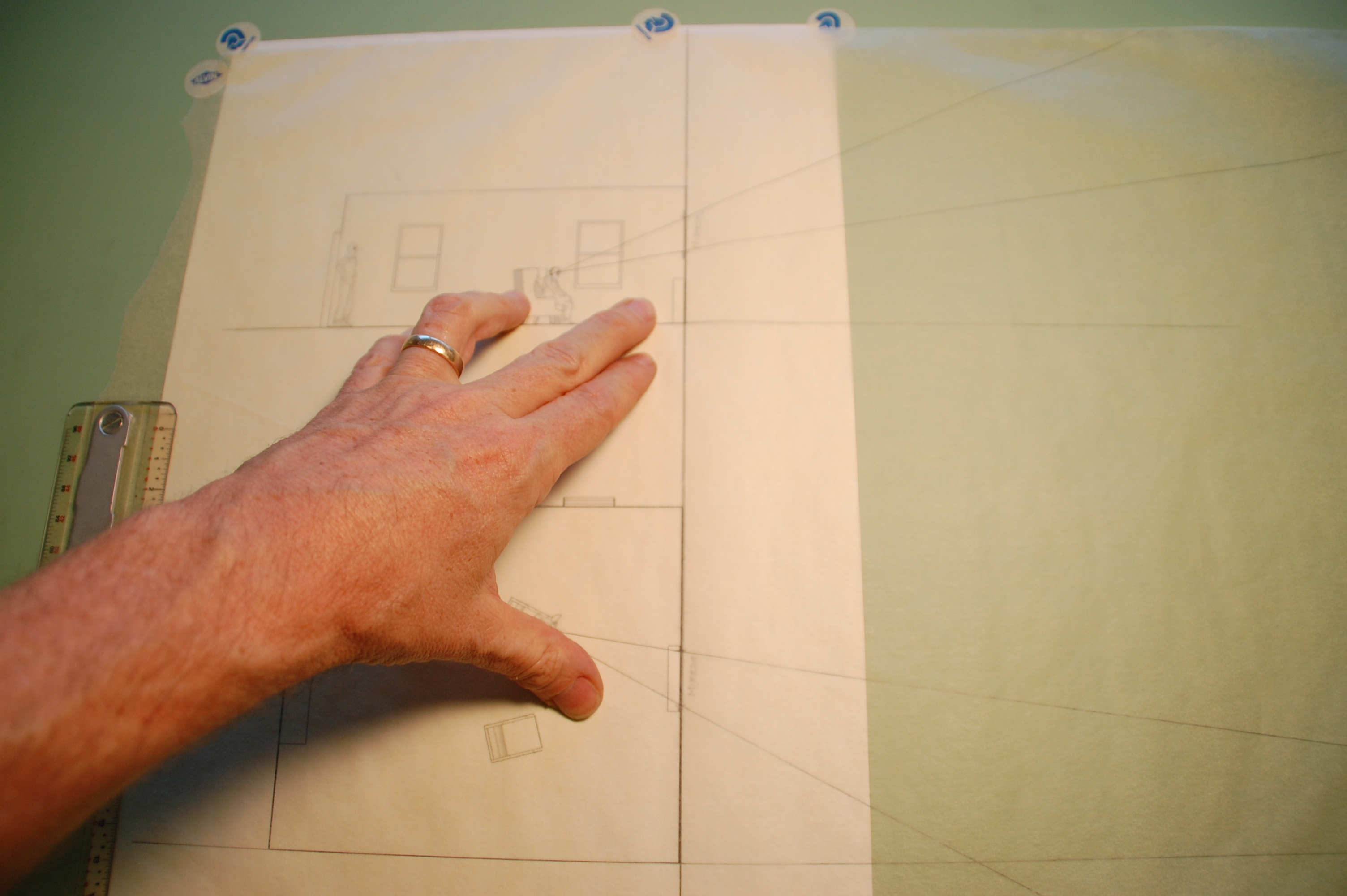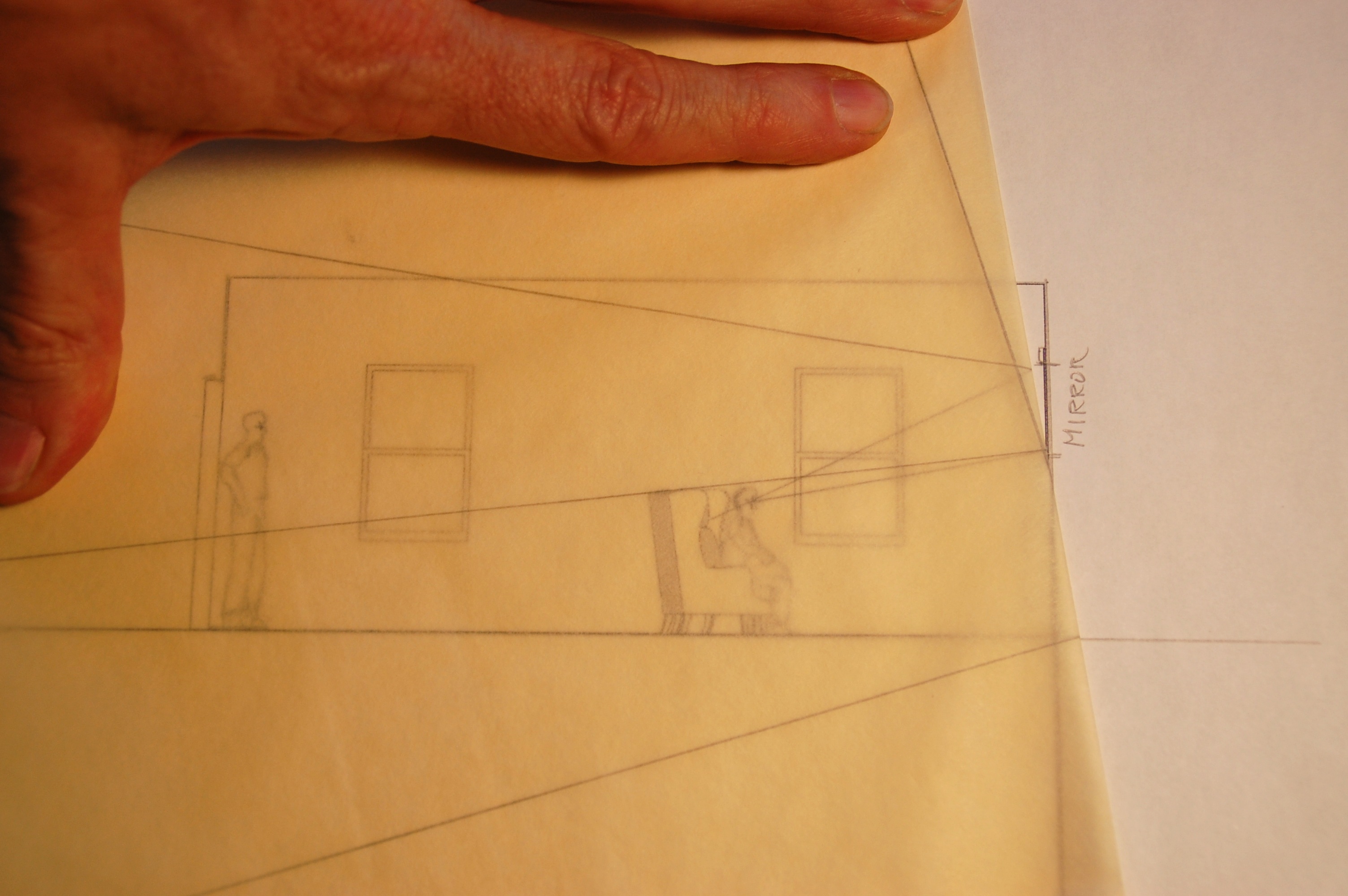You’ll want to have the plan view and an elevation. Line them up so that the plane of the mirror is along an identical line. It doesn’t have to be in any certain scale as long as they are both the same size. It can be a printout or just a quick drawing on grid paper, as long as the mirror is correctly placed and sized.