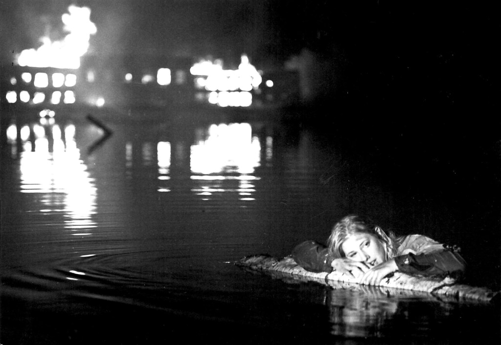 I used the headlights of a car for the key light on the actress Liana. A fog machine, run by my cousin Greg, was positioned next to the car to give some depth to the background as well as to diffuse the illumination from the headlights. The Assistant Director, Jan, helped the actress into position in the water.