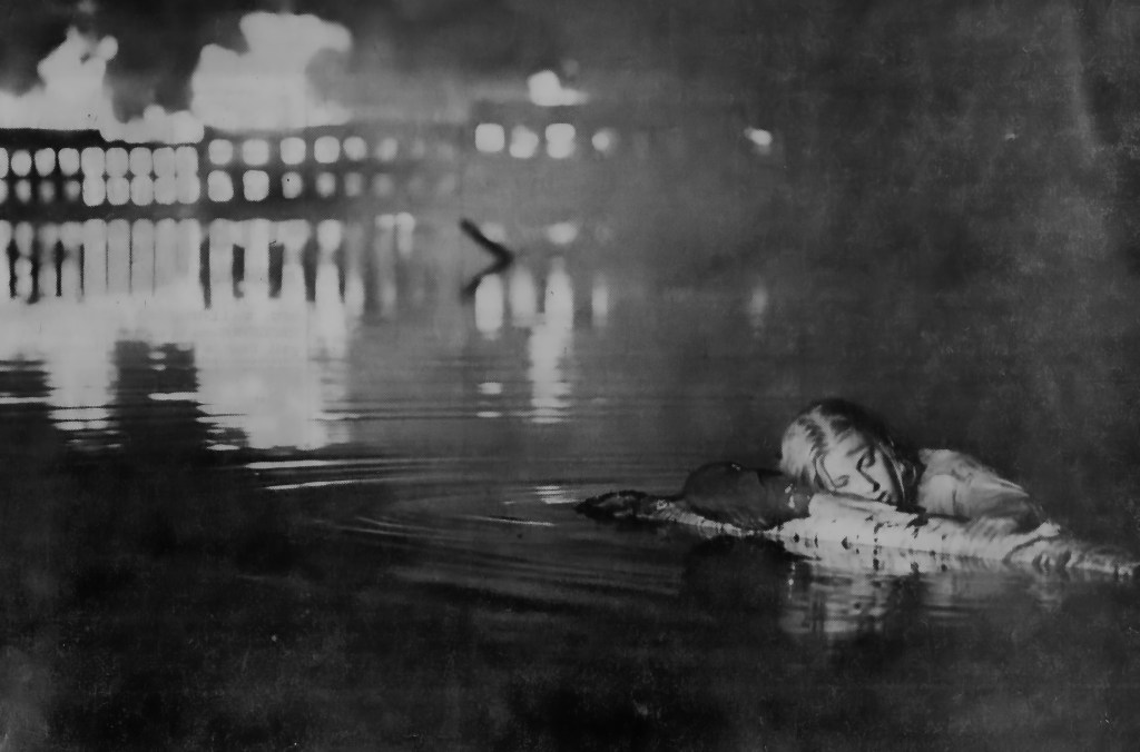 The 25mm, focused at 16 feet away, and with an f-stop setting of about 2.8, would give me a depth of field of about 20 feet total. The Kodak Tri-X 7266 film stock had an ASA of 200, so I had to shoot almost at full aperture to have enough light on the actress. I spot metered several times from her face to the fire after it started before I was sure about my exposure. The f-stop spread convinced me that the front of the miniature would be solid black and out of focus, devoid of detail.