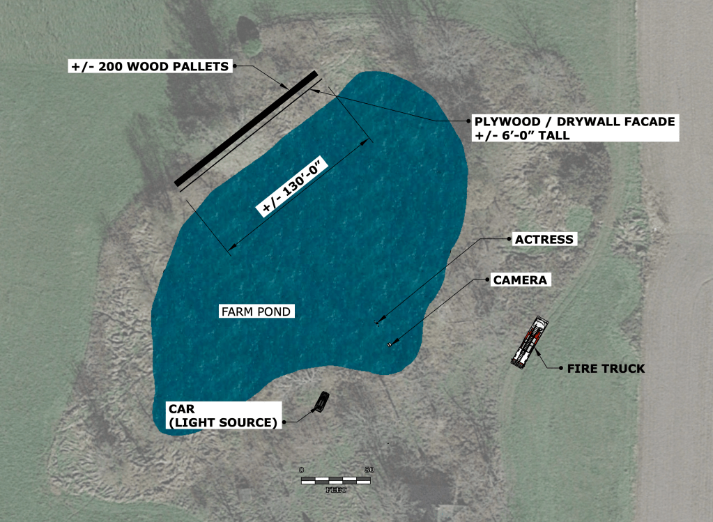 It took about three weeks to truck all the materials to the farm pond where I planned on filming the scene. When everything was finally at the site, we had accumulated over 200 discarded wood pallets, over 24 sheets of plywood of various types and random pieces of drywall and corrugated metal. Since all the materials were donated, I estimated that the final cost of the miniature was $150 based on the cost gas for the vehicles and fire accelerant, i.e. kerosine.