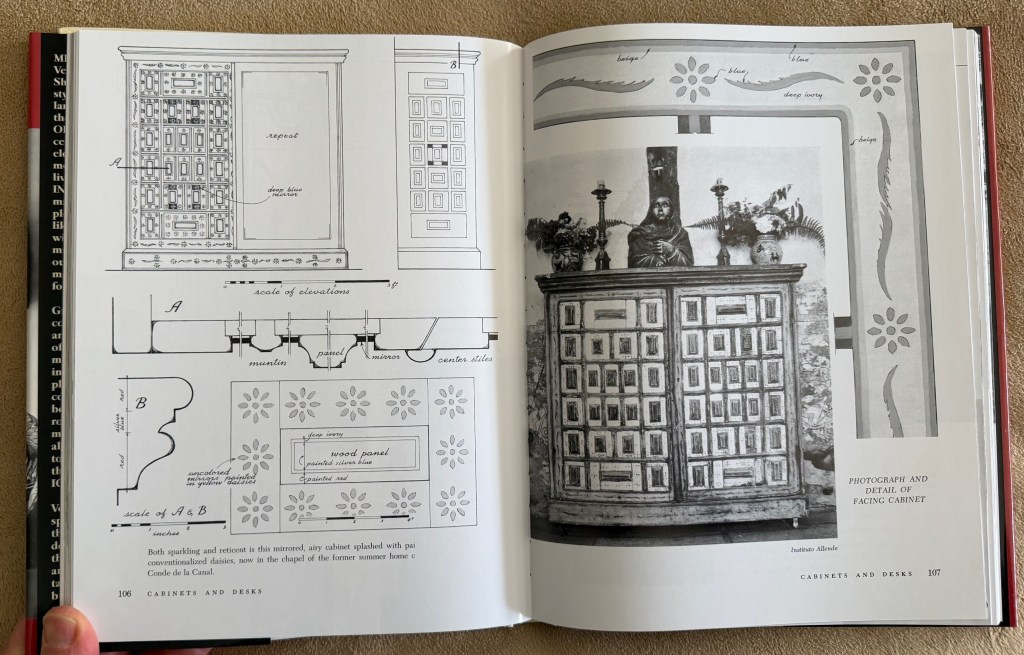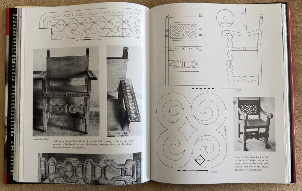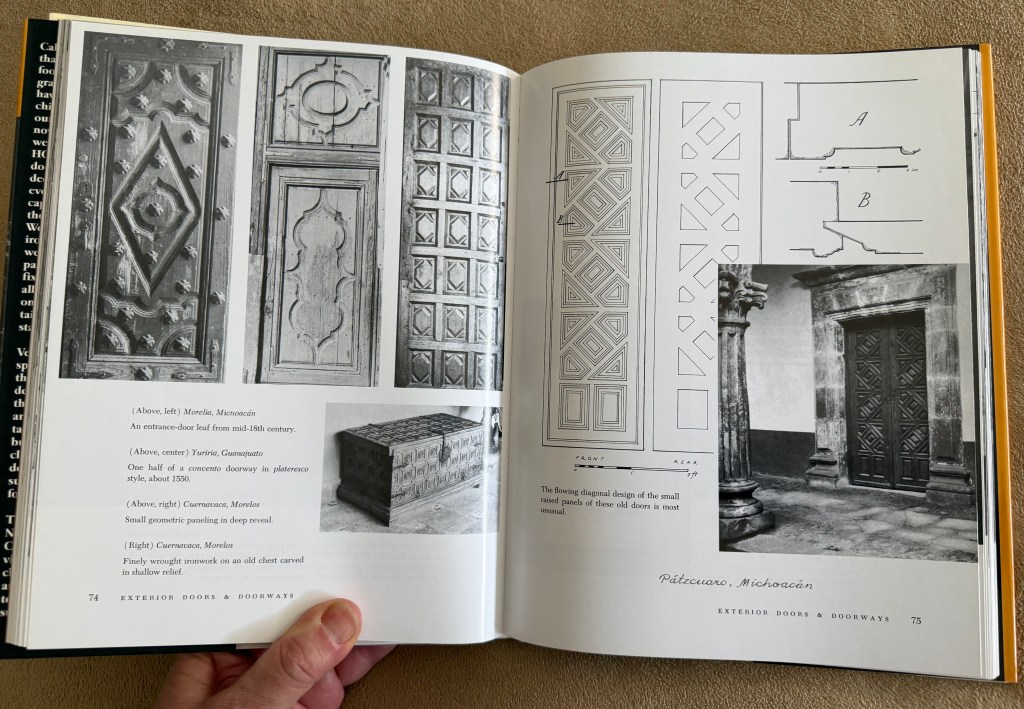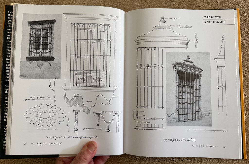The follow-up book, Mexican Interiors, dealt more with furniture and other furnishings but includes architectural elements as well and follows the same layout of photos layered with measured drawings.