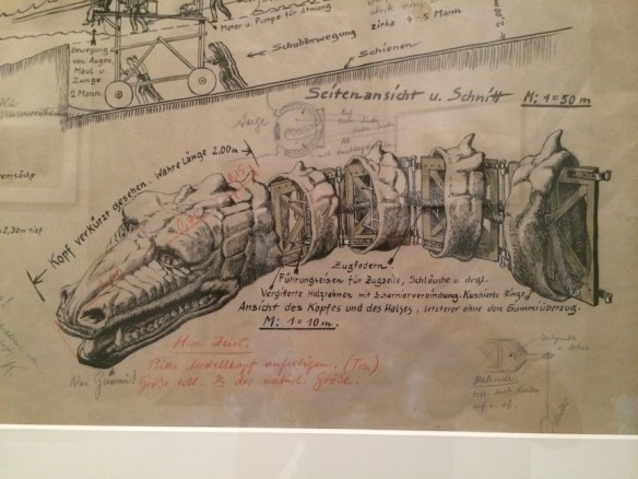 Kettelhut called out the length of the neck as well as the tension springs, framework, control cables and hoses required for the creatures fiery breath. He calls out “only rubber!” for the mouth area.
