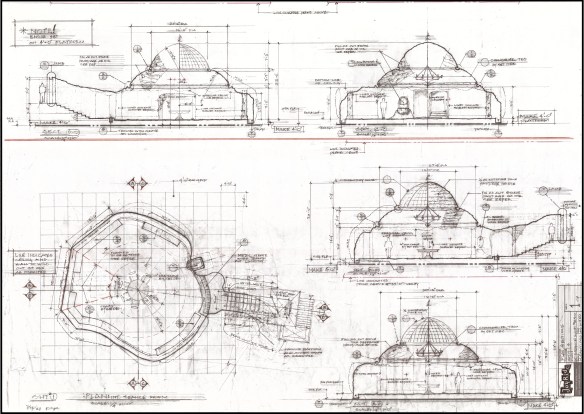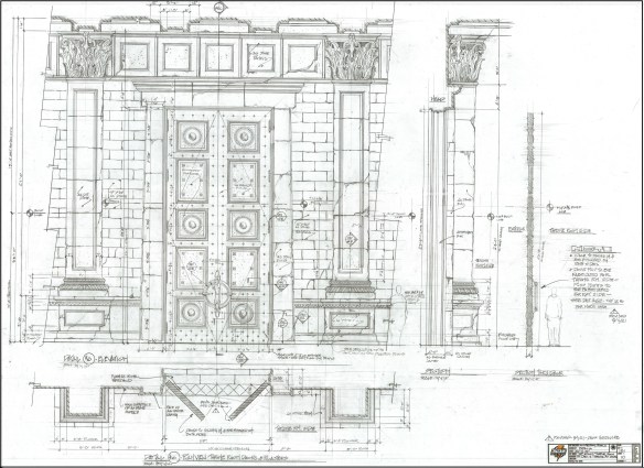 I mentally put together a list in my head of the equipment that we’d need to do an accurate survey of the building but that was immediately discarded when I was told about the limitations of the scale of the survey. It would have to be done at night, after the park was closed to the public. I would have a park employee to help who would also provide a ladder. One of the construction foremen on the film would meet me there to help with the measuring.